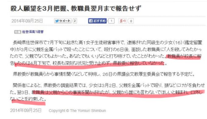読売新聞によれば、佐世保北高は、犯人の担任が校長に報告をするのを、担任自身の判断でわざと遅らせたとあります。
