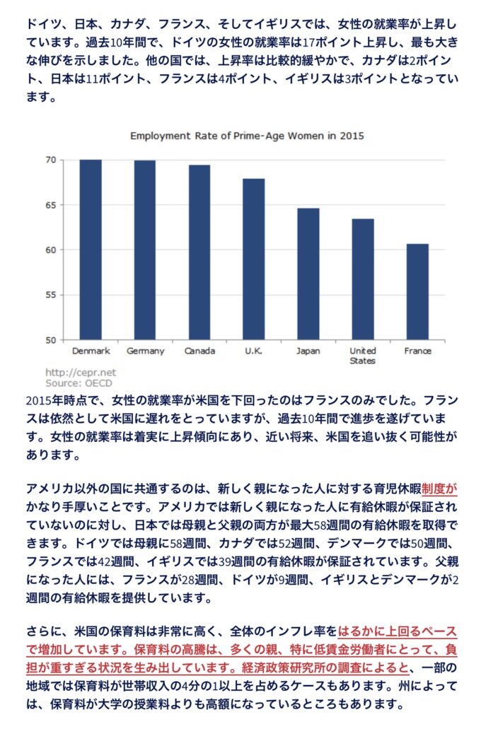 上記図をご覧ください。女性就業率、日本はアメリカ、フランスより高くなっています。