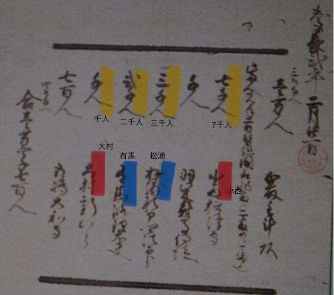名古屋市秀吉清正記念館パンフレットに掲載されている慶長の役(1597年)陣立(じんだて)書という書面。朝鮮出兵のさいに、大村からは千名が出兵(上段左から二番目)。いとこの島原の有馬は二千名(上段左から三番目)。さすがは小西行長公、七千名も。