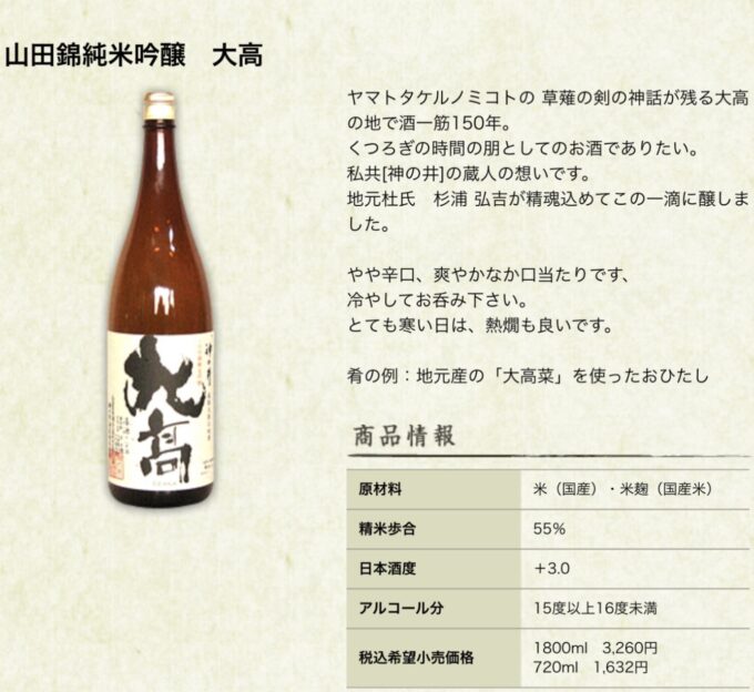 神の井酒造では「大高」という酒を出しています。他に、大高の地元名古屋に、酒の肴(さかな)として、おひたしの大高菜というものがあります。