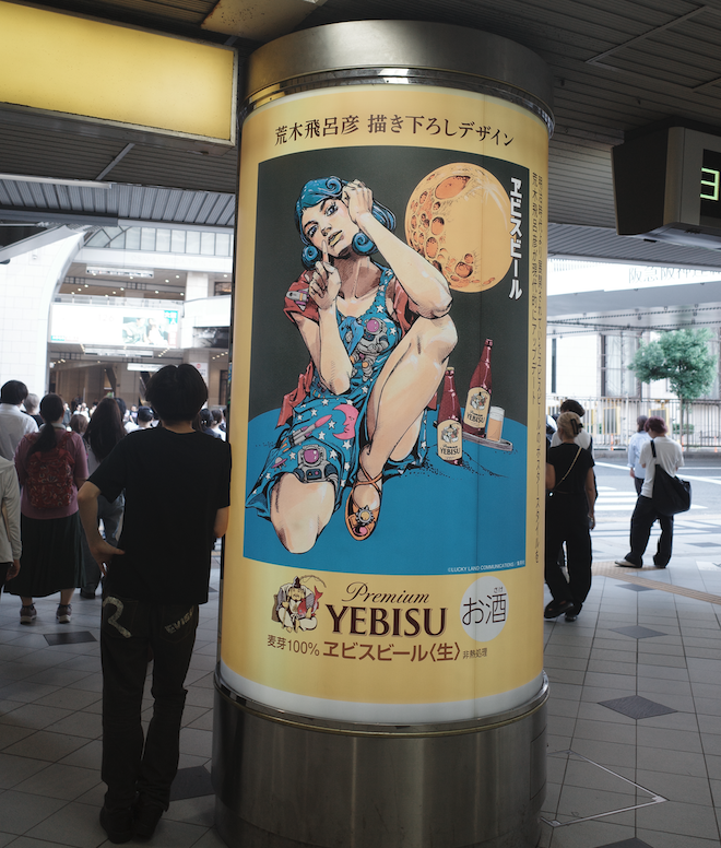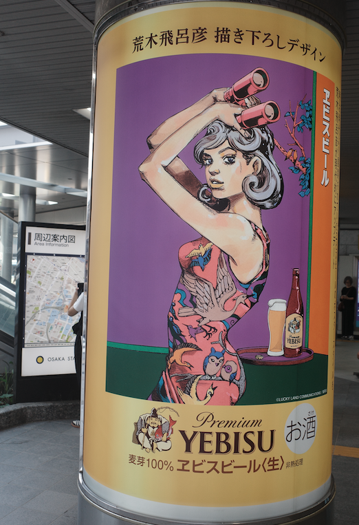 大阪出張。JR大阪駅にて。ジョジョと恵比寿ビールのポスター