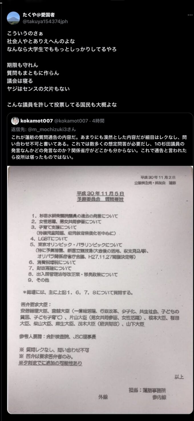 蓮舫(立憲民主党)の国会質問通告が高校生レベルだと話題に
