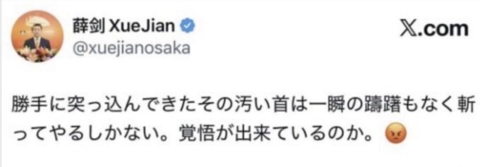 中国・大阪総領事の薛剑(セツケン)氏、内政干渉し、「高市総理の首を切ってやるしかない」と日本語で日本国民にむけ発言