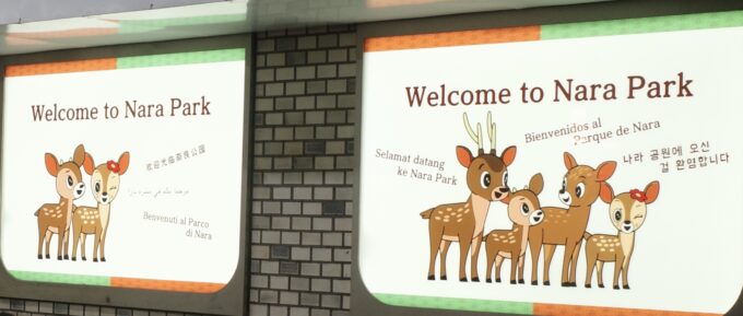 ↑奈良公園の鹿に関するポスター:奈良駅