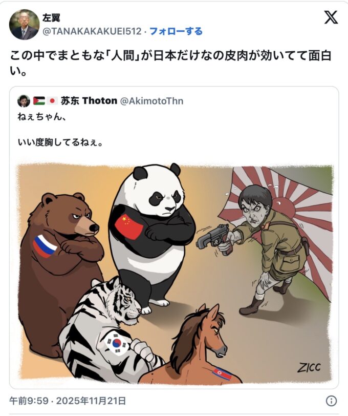 ↑中国の風刺画:中国人が日本人をバカにした風刺画なのかもしれませんが、人間は日本だけなので、これはある意味正しい。人権があるのは日本国の日本国民だけ。話が通じない国は動物扱いです。