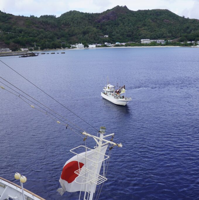 父島から小型の船で南島に向かいます。大村湾と違い、外洋で水深も深いので、波が高いです。