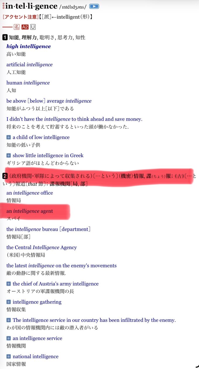 動画の中に出てくるコバホーク(小林議員)が口にする「インテリジェンス」の正確な意味は以下。