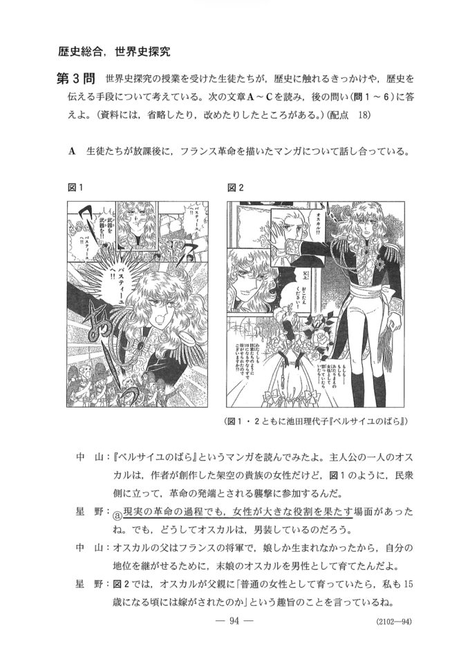 令和8年(2026)1月17日に実施された、大学入学共通テスト歴史総合・世界史探究の第3問にマンガ「ベルサイユのばら」が出題者されました。