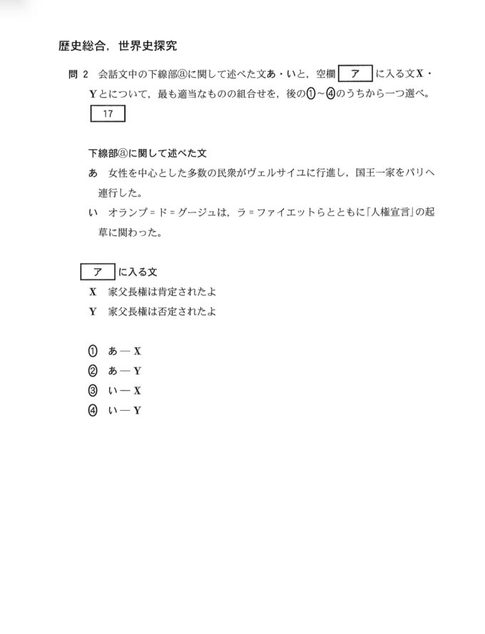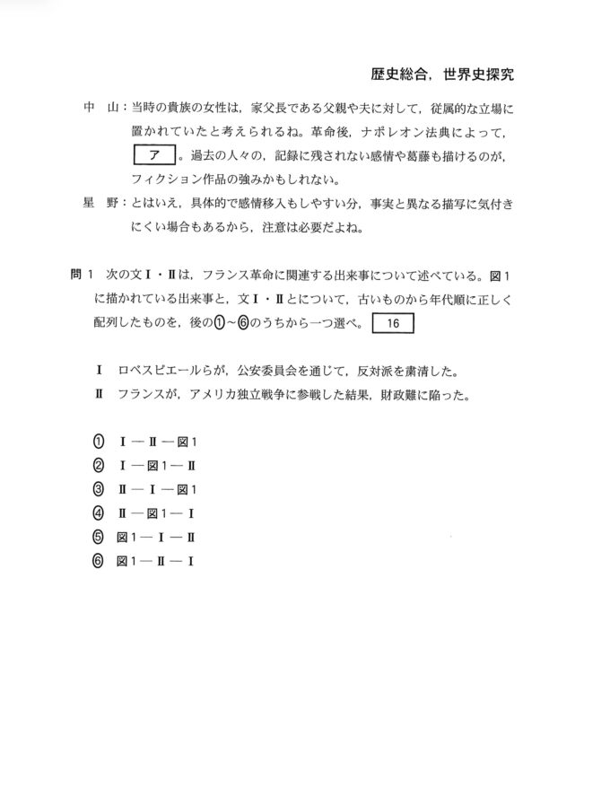 マンガ『ベルサイユのばら』の一コマで、主人公の一人であるオスカルが「バスティーユへ!!」と民衆を鼓舞する場面から、図1は国民議会時代のバスティーユ牢獄襲撃の時期であると判断する。Iは国民公会の時代、IIはフランス革命勃発前の時代である。問2.オランプ=ド=グージュが人権宣言では男性の権利のみが規定されており、女性の権利が規定されていないとして、『女性の権利宣言』を著したことや、ナポレオン法典が家父長権を肯定するという内容を含んでいることは、歴史総合のほか世界史探究の多くの教科書で言及されている。
