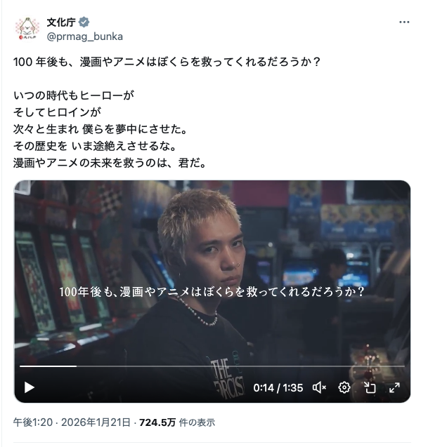漫画やアニメの未来を救うのは、君だ。 pic.twitter.com/w3U9HSjTn7— 文化庁 (@prmag_bunka) January 21, 2026