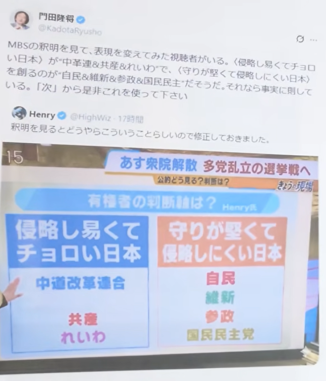 高市さんが嫌いでたまらない、中国共産党の意向に沿って動く反日勢力(朝鮮民族、中国人)が考え実行し、ウソを放送し、願望を事実だと放送した証拠になっています。日本の公共の電波を使用して、中国の指示通りにウソを放送してはいけないのでは?