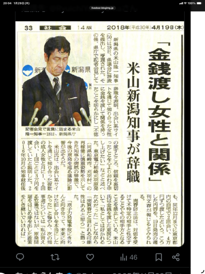 Xより↑中革連の米山隆一(買春がバレ、知事を辞任した経験あり)さん。またまた、奇妙なことをしでかして、炎上されているようです。