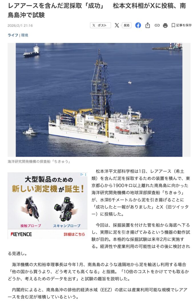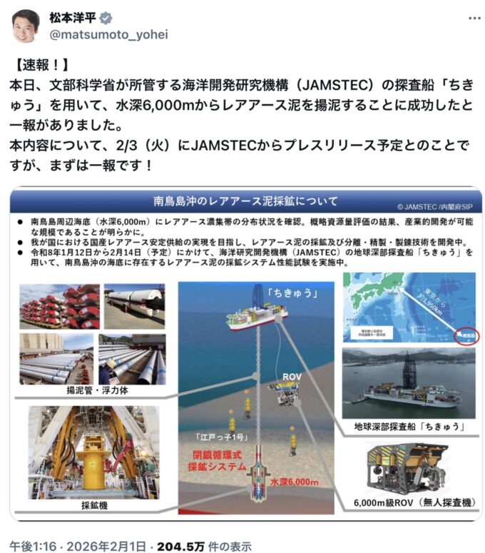 南鳥島EEZ海域でのレアアース泥採鉱システム接続試験の状況について(速報)https://t.co/l5gqf8N2PD#レアアース #SIP… pic.twitter.com/k0vKOgionN— JAMSTEC 海洋研究開発機構 \海と地球の研究所/ (@JAMSTEC_PR) February 3, 2026