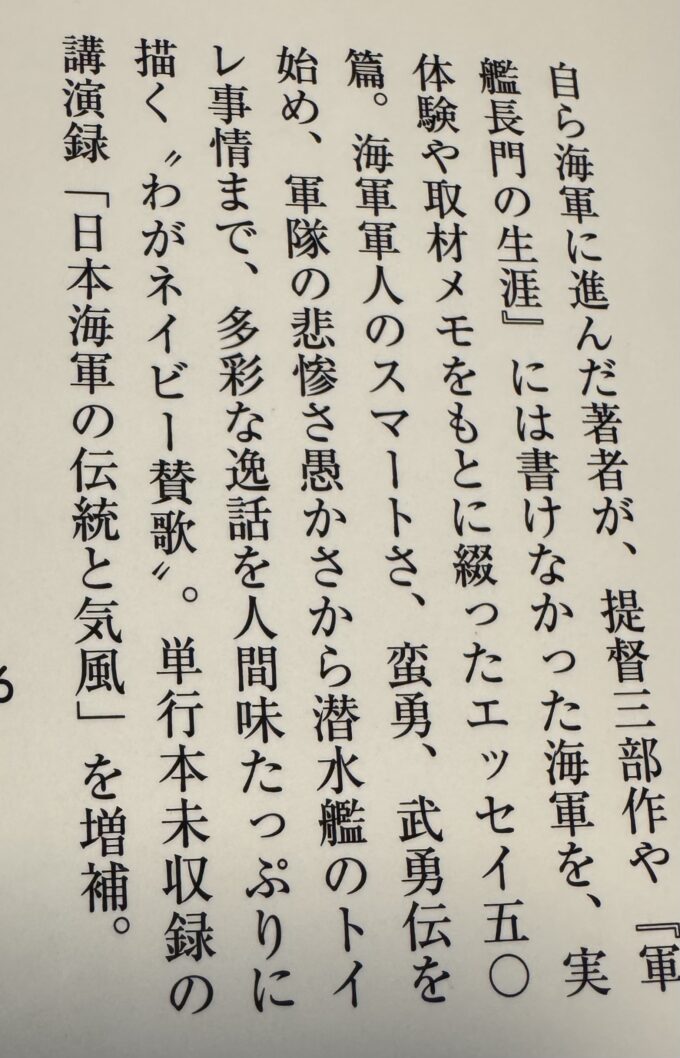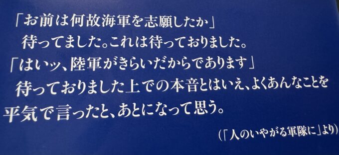 著者の阿川弘之氏が広島出身で、広島にあった海軍兵学校(現在の防衛大学校・海上自衛隊に就職希望者向け)の出身。