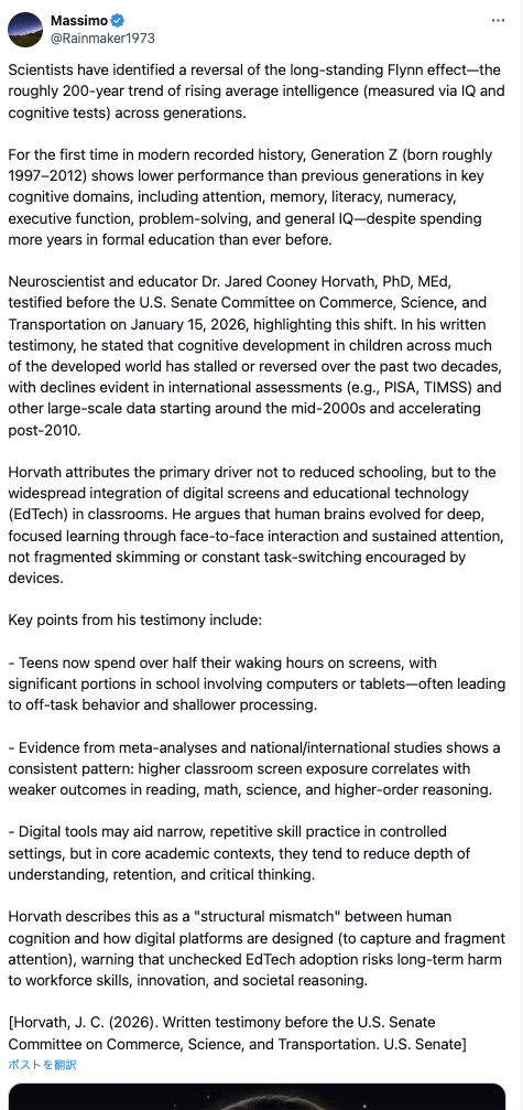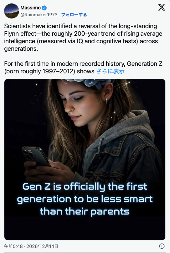 Z世代、人類史上はじめて、世代レベルで知能が低下