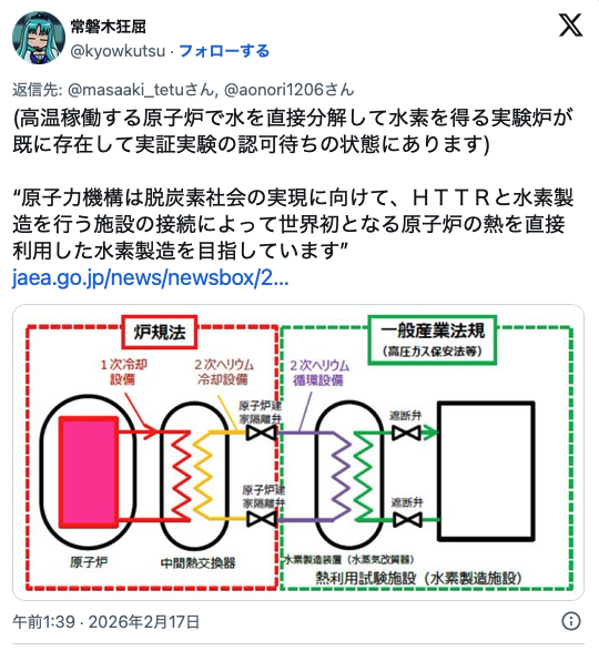 今後の石油から水素へのエネルギー転換時代を見据え、水素製造のためにも、原子炉は動かし続けるべきで、目先のことしか考えていないように見える反原発派などに耳を貸さないようにしたいですね。ドイツは反原発派の意見を受け入れ、原発をすべて止めてしまったため、今では大変なことになっています。フランスは動かしています。