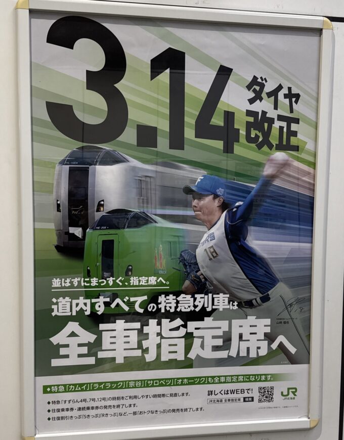 おそらく中国人など外国人が自由席でトラブルをおこすので、JR北海道の特急は全席指定席になるようです。私もしばしば見ましたが、混雑しているのに、一人で2席分に荷物を置いて、他の人をすわらせないようにする中国人が多いためでしょう。また、JR北海道はJR東日本の「えきねっと」で、簡単に特急指定席が予約できますから。