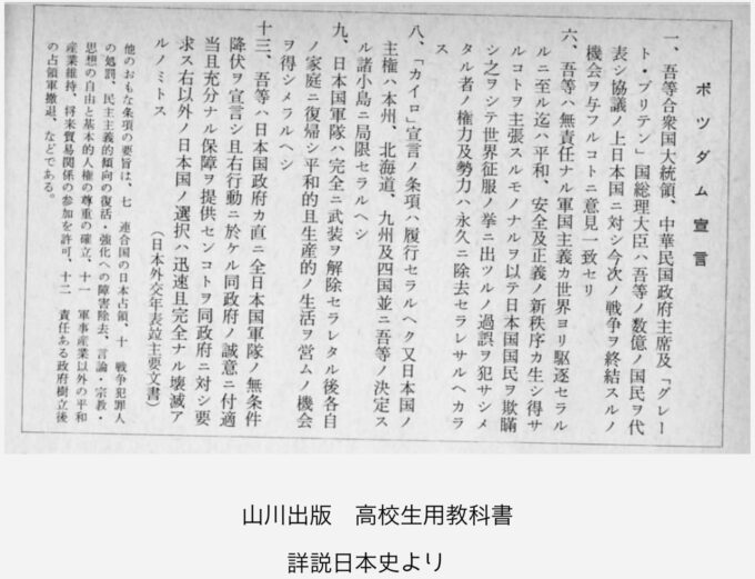 前にも、当サイトでは書かれていますが、ポツダム宣言の原文を見てください。解釈は分かれますが、無条件降伏ではないことが書かれた、重要な条文をわざと掲載しなかった教科書、そしてウソを教え続けた教員たち。