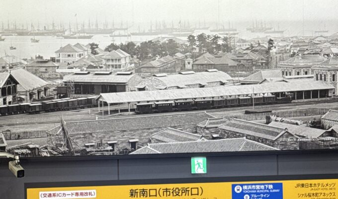 ↓当時の横浜駅(現在の桜木町駅)の写真:現在の桜木町駅新南口に展示してあります(誰でも撮影可能)。横浜港に来航している船は大きく、数が多い。長崎港は小さいため、ここまでの数が停泊できません。