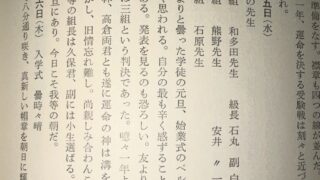 昭和19年(1944)4月 敗戦の1年前です。大村高校の前身・旧制大村中学の入学式の日です。 当時は1学年3組制で定員100名でした。女性は、大村高等女学校で、別の学校でした。 在校生日記に関しては、デジタル化して電子本 … 続きを読む 第二次世界大戦中 旧制大村中学(大村高校の前身)生徒の在校生日記 4