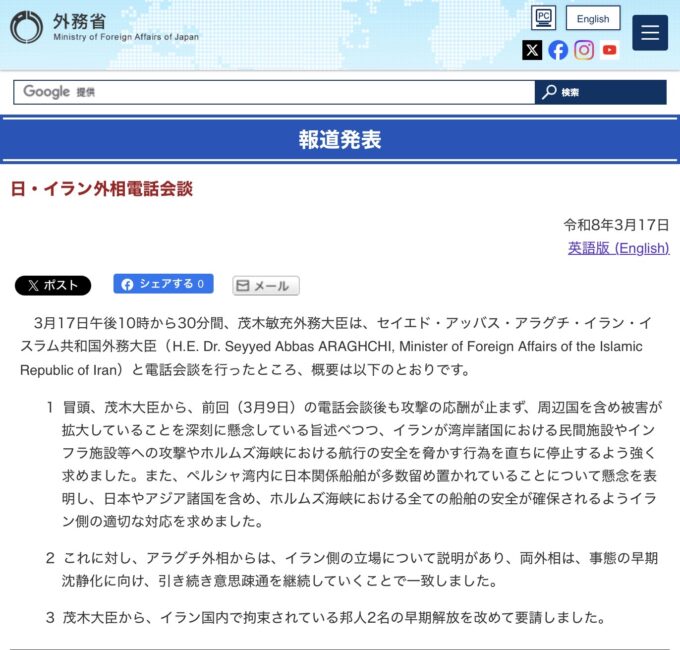 外務省発表:日本とイランの外務大臣の会談内容