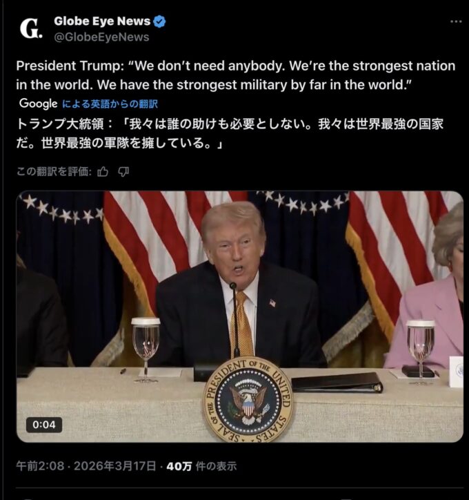 トランプ大統領は、各国にタンカー輸送護衛艦艇を要請していました(日本には機雷掃海艇を)が、トランプ大統領の方針が変わったようです。