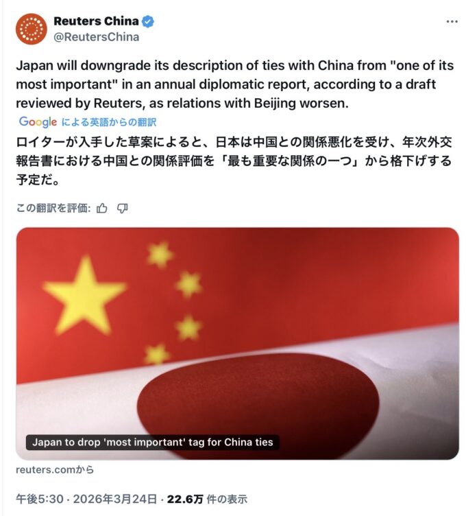 東京、3月24日(ロイター) – ロイターが入手した草案によると、日本は中国との関係悪化を受け、年次外交報告書における中国との関係の表現を「最も重要な関係の一つ」から格下げする予定だ。