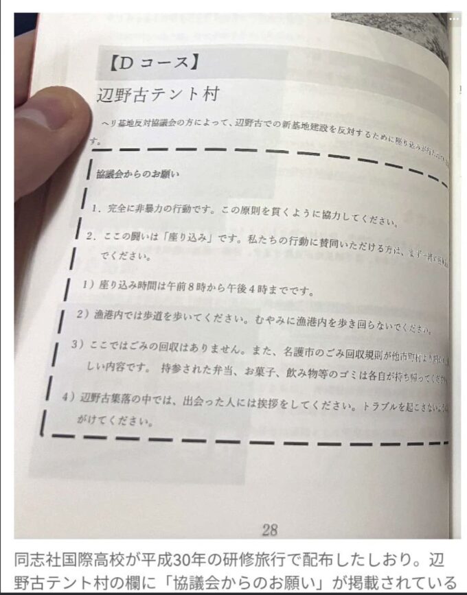 京都・同志社国際高の修学旅行、沖縄で左翼の活動拠点に行かせて、高校生に座りこみまでさせて、共産党の活動家になるため?の教育をしてきたことが判明。長崎県、平和教育の名で、活動家の被爆者を、左翼の団体に金を払って呼び寄せ、むりやり話を聞かせる活動をしてないか?