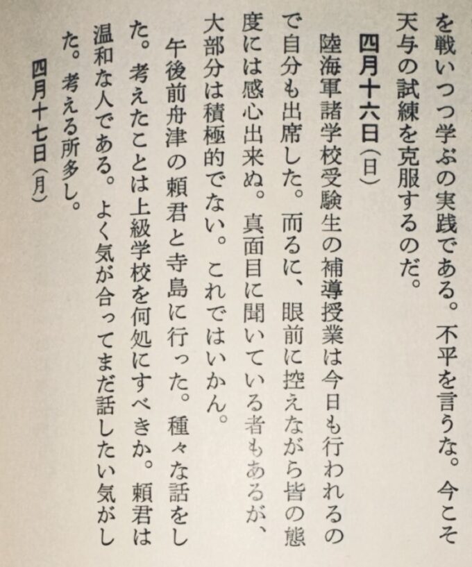 作者は、大村高校の前身・旧姓大村中学校での補習授業の後、現在の久原一丁目(東浦と前舟津)にある、寺島に行って、クラスメイトと話したりしています。