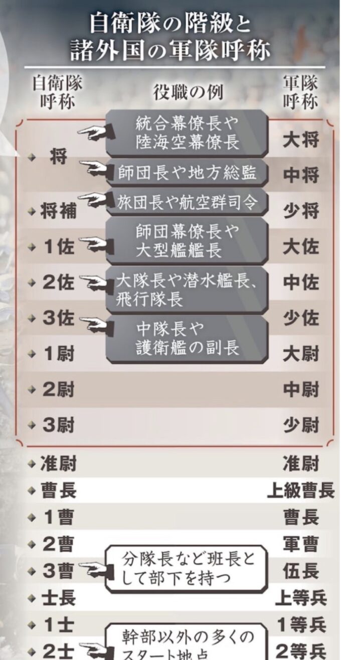 *軍の階級(産経新聞より):自衛隊も軍と同じ階級に戻すようです(陸軍士官学校、海軍兵学校、防衛大学校を卒業したら、最初から少尉です)