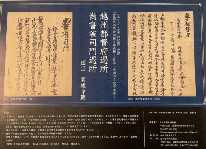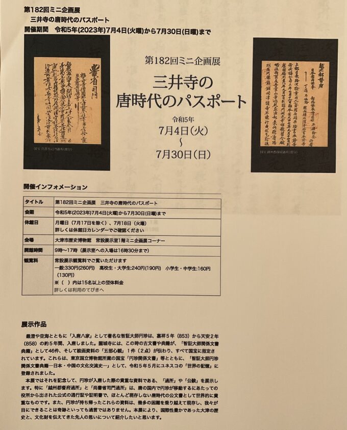 9世紀の古い話ですが、当時のパスポートが滋賀県に残されていて、ユネスコの世界の記録に登録され、令和5年(2023)滋賀県大津市の大津市歴史博物館で特別展が開催されたので、行ってきました。