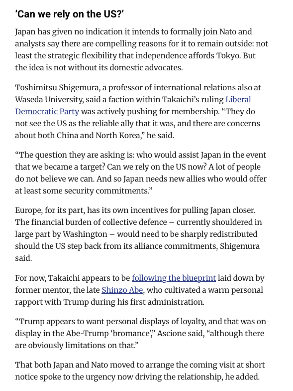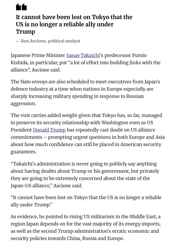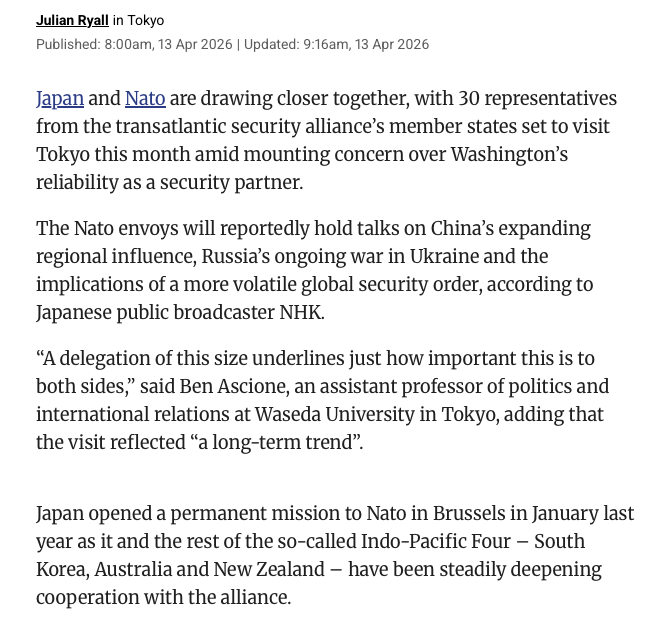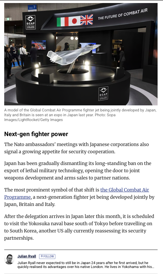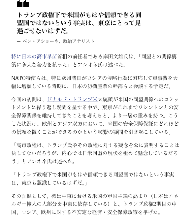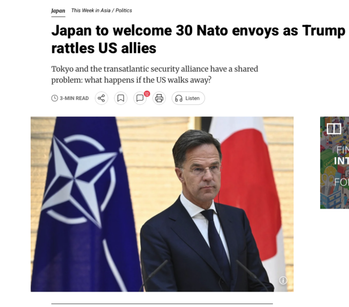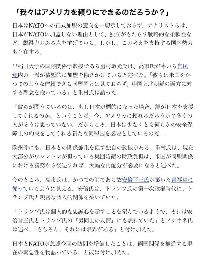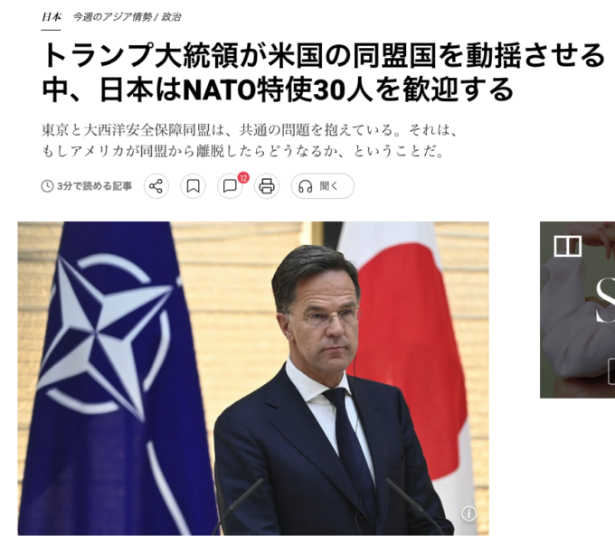 さて、アメリカがあてにならなくなってきたので、NATOは日本と関係を強化し、軍事同盟のために特使を送り込んだのでしょうか。しかし日本はアメリカにのりました。欧州(NATO)はアメリカにのりませんでした。NATOの思惑が外れたからでしょうか。