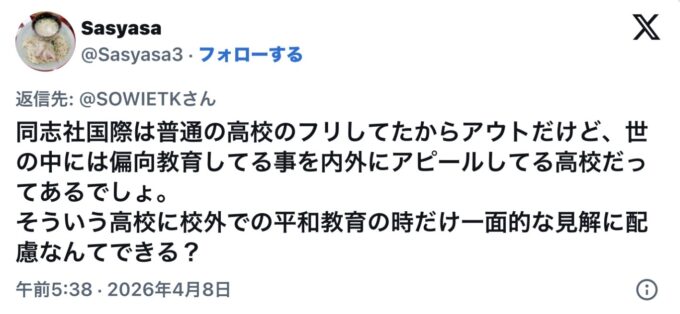 長崎県が大好きな「平和教育」という思考停止の洗脳教育です。一つの典型例として紹介しますが、長崎東高が、おこなっている平和教育。生徒の名前まで出して、インスタで大きく自慢しています。徹底的な平和教育という洗脳をほどこし、思考停止した人間ばかり送り出すのが長崎県がすすめる教育なのでしょうか?
